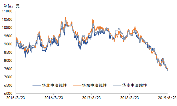 2019年可謂是自2015年以后PE產(chǎn)品最低迷的一年,國(guó)內(nèi)的PE價(jià)格在年初的一波拉漲之后持續(xù)下行,經(jīng)歷了6月初一波破位下行之后,市場(chǎng)謹(jǐn)慎心態(tài)凸顯,截止8月23日,期貨跌至2015年以后最低點(diǎn),現(xiàn)貨市場(chǎng)也因供需基本面弱勢(shì),加之長(zhǎng)時(shí)間持續(xù)陰跌導(dǎo)致的慣性心態(tài)看空,持貨商持續(xù)讓利出貨。