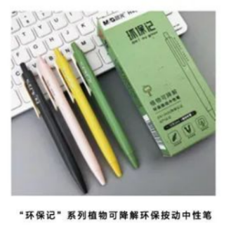 由秸稈、甘蔗渣、杉木粉等植物殘?jiān)崛?、發(fā)酵、聚合得到的聚乳酸,是一種具有可生物降解性能、生物相容性能的生態(tài)環(huán)保材料。晨光將其應(yīng)用與 “環(huán)保記”系列植物可降解環(huán)保按動(dòng)中性筆的筆桿。