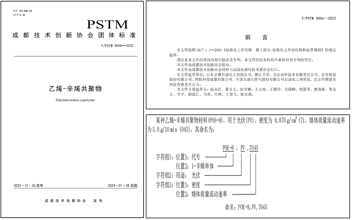 該標(biāo)準(zhǔn)由京博石化牽頭起草,由成都技術(shù)創(chuàng)新協(xié)會(huì)材料與試驗(yàn)標(biāo)準(zhǔn)化技術(shù)委員會(huì)歸口,浙江大學(xué)、北京高科技術(shù)有限責(zé)任公司、金發(fā)科技股份有限公司、同軌科技成都有限公司、中國(guó)石油天然氣股份有限公司石油化工研究院、北京華塑晨光科技有限責(zé)任公司共同參與起草,于2023年1月28日正式實(shí)施。標(biāo)準(zhǔn)規(guī)定了乙烯-辛烯共聚物的命名、要求、試驗(yàn)方法、檢驗(yàn)規(guī)則、標(biāo)志和隨行文件、包裝、運(yùn)輸和貯存。標(biāo)準(zhǔn)適用于由乙烯與 1-辛烯通過溶液聚合工藝所生產(chǎn)的乙烯-辛烯共聚物,共規(guī)定了通用及光伏用途的5種牌號(hào)產(chǎn)品,選取熔體質(zhì)量流動(dòng)速率最具代表性的三個(gè)標(biāo)稱值范圍進(jìn)行要求,可代表市面上大多數(shù)產(chǎn)品要求。