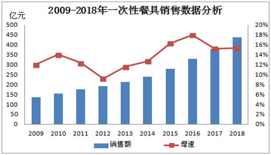 由上圖2009-2018年一次性餐具數(shù)據(jù)分析發(fā)現(xiàn),餐飲數(shù)據(jù)整體增幅可觀,2018年一次性餐具銷售規(guī)模約436億元,同比2010年155億元增幅181.29%,可見一次性餐飲市場規(guī)模發(fā)展速度極快。由于伴隨國民消費(fèi)水平提高及現(xiàn)在快節(jié)奏社會生活影響,一次性餐具消費(fèi)規(guī)模呈現(xiàn)令人驚訝速度增長。