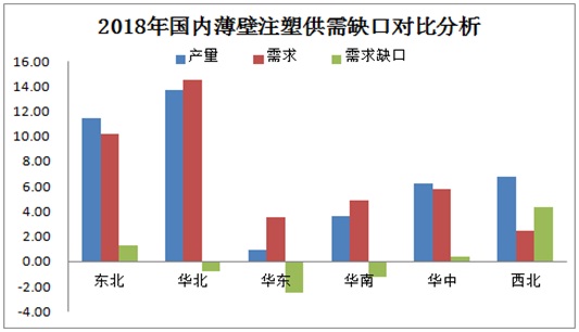 由薄壁注塑供需缺口數(shù)據(jù)對比分析發(fā)現(xiàn),需求缺口集中在華北、華東及華南地區(qū),而供需失衡地區(qū)多集中在西北及東北地區(qū),兩地多以貨源調(diào)撥至各大區(qū)域以緩解當(dāng)?shù)毓┬枋Ш饩謩?。華東地區(qū)供需缺口較為明顯,但因華東地區(qū)受環(huán)保政策影響,在2018年4月27日當(dāng)?shù)卣雠_餐盒使用標(biāo)準(zhǔn),該標(biāo)準(zhǔn)推行后,外賣行業(yè)將采用生產(chǎn)技術(shù)較為成熟得淋膜紙碗替代塑料送餐盒,約可減少75%以上得塑料垃圾。由于該政策提出,華東地區(qū)整體薄壁供應(yīng)量明顯下降。