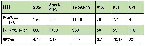 目前的屏幕基底材料以玻璃為主,但是玻璃不能彎曲折疊,因此塑料的特性成為折疊屏眼下最適宜的基底材料。熒幕基底換成薄膜后不僅基底能夠折疊,還可提高屏幕的抗摔性,同時屏幕更加輕薄。以下為列舉的幾種主要基底材料性能對比;